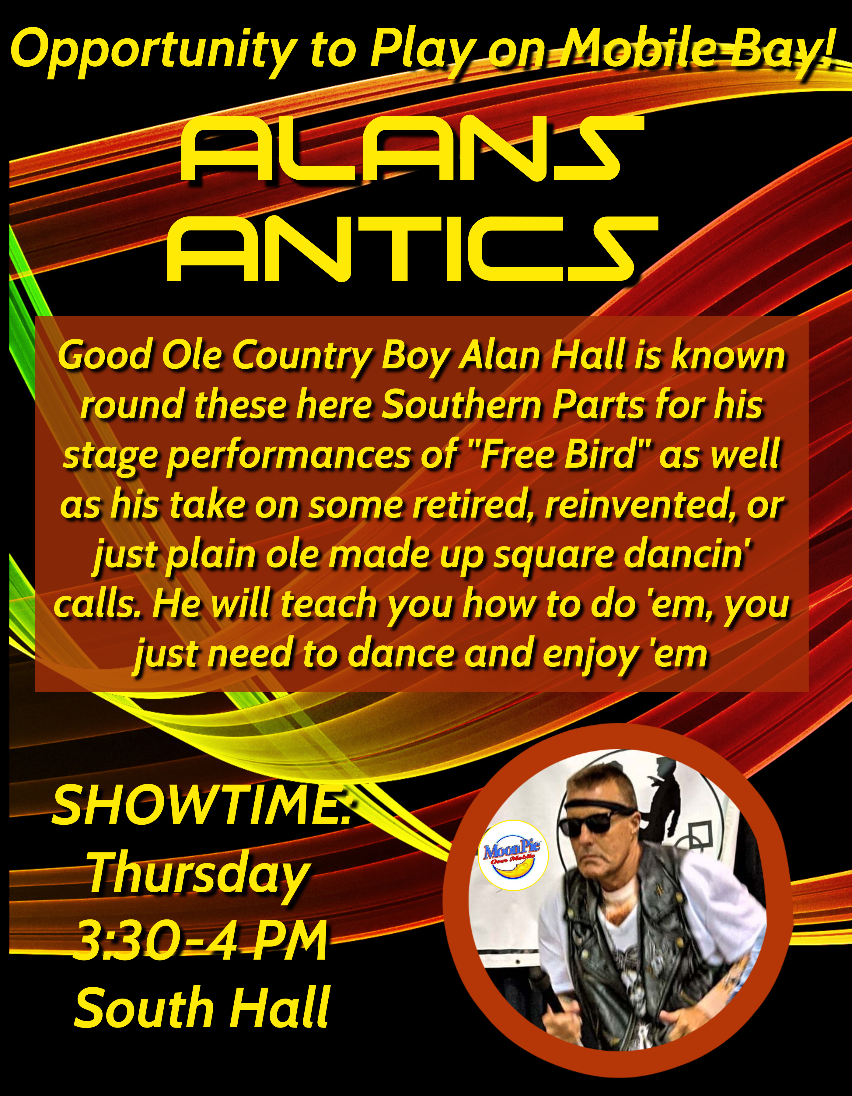 Good Ole Country Boy Alan Hall is known round these here Southern Parts for his stage performances of "Free Bird" as well as his take on some retired, reinvented, or just plain ole made up square dancin' calls. He will teach you how to do 'em, you just need to dance and enjoy 'em. Dancers register at www.72nsdc.com for a fee. Since all who enter the Convention Center must have a name badge, non-dancing guests please email your full name, city and state to registration@nsdc.com to have your free name badge waiting on you at our Registration Booth as you enter the Convention Center.