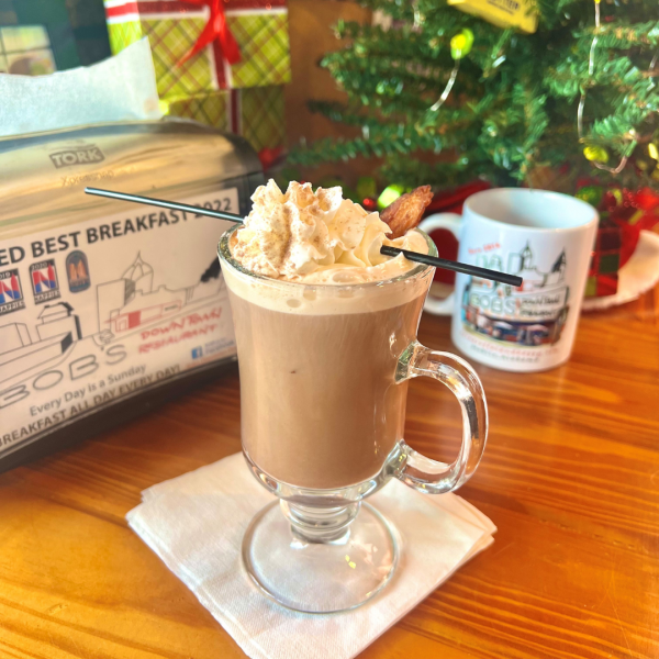 Hot chocolate with a sweet and salty twist! Warm up with Bob's hot chocolate featuring Jameson Irish whiskey, Bailey's Irish Cream, and topped with bacon! (21+)