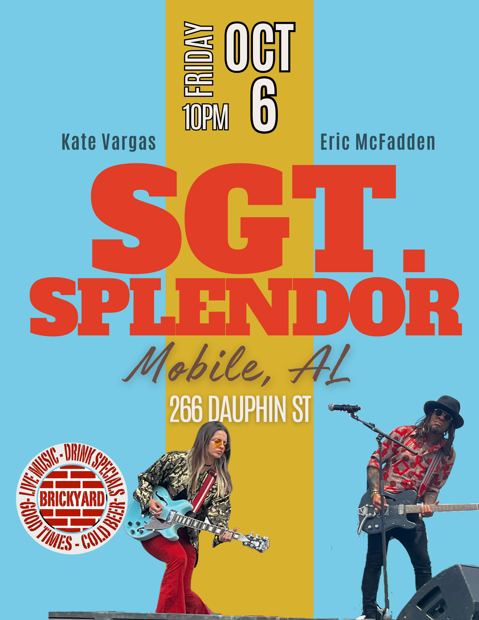 Get ready for Sgt. Splendor LIVE at The Brickyard! Amazing vocals and skillful guitar playing, the two seamlessly groove together. you'll have to see it for yourself! Before joining forces, the duo behind Sgt. Splendor were already formidable solo artists, Kate Vargas chalking up acclaim at outlets like NPR, SPIN and Vice (including praise from the "Dean of American Rock Critics" Robert Christgau); and Eric McFadden amassing an impressive resume including stints on guitar with George Clinton & the P-Funk All Stars, Anders Osbourne, Fishbon's Angelo Moore, and Eric Burdon & The Animals, plus a slew of solo albums, and session work with everyone from Jackson Browne to The Clash's Joe Strummer. Performing with a rotating all-star rhythm section, you never know who you're going to see with Sgt. Splendor but the house will be brought down with an infectiously feel-good blend of funk, blues, and rock n' roll!